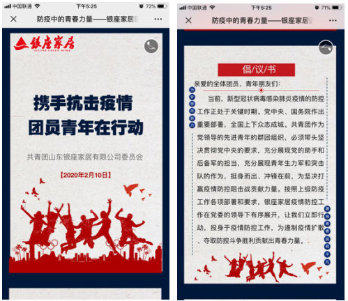 當前,新冠肺炎疫情防控工作正處于關鍵時期。2月10日,銀座家居團委發出主題為“攜手抗擊疫情,團員青年在行動”的倡議書,動員全體團員、青年立即行動,投身于疫情防控工作,為遏制疫情擴散、奪取防控斗爭勝利貢獻出青春力量。