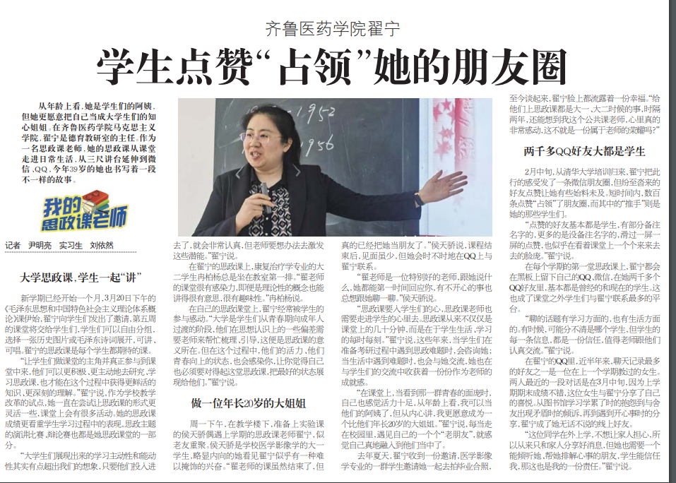 從年齡上看,她是學(xué)生們的阿姨,但她更愿意把自己當(dāng)成大學(xué)生們的知心姐姐。在齊魯醫(yī)藥學(xué)院馬克思主義學(xué)院,翟寧是德育教研室的主任。作為一名思政課老師,她的思政課從課堂走進(jìn)日常生活,從三尺講臺(tái)延伸到微信、QQ,今年39歲的她也書寫著一段不一樣的故事。