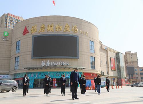 銀座濰坊青州店員工及管理人員在主通道莊重站立進行默哀活動。