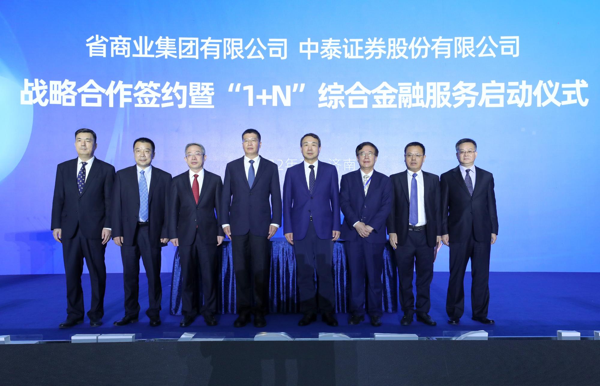 7月8日,魯商集團與中泰證券戰略合作簽約暨“1+N”綜合金融服務啟動儀式在山東大廈舉行。魯商集團黨委書記、董事長兼山東文旅集團董事長高洪雷,中泰證券黨委書記、董事長李峰,魯商集團黨委副書記、總經理郭訓成,黨委副書記、董事劉守亮,黨委常委、董事、組織人力資源部部長李林,黨委常委、紀委書記、省監委駐集團監察專員劉天海,黨委常委、董事、總審計師、工會主席劉德華,中泰證券黨委副書記、監事會主席郭永利,副總經理、財務總監袁西存,副總經理、中泰期貨黨委書記、董事長、首席服務官鐘金龍出席。