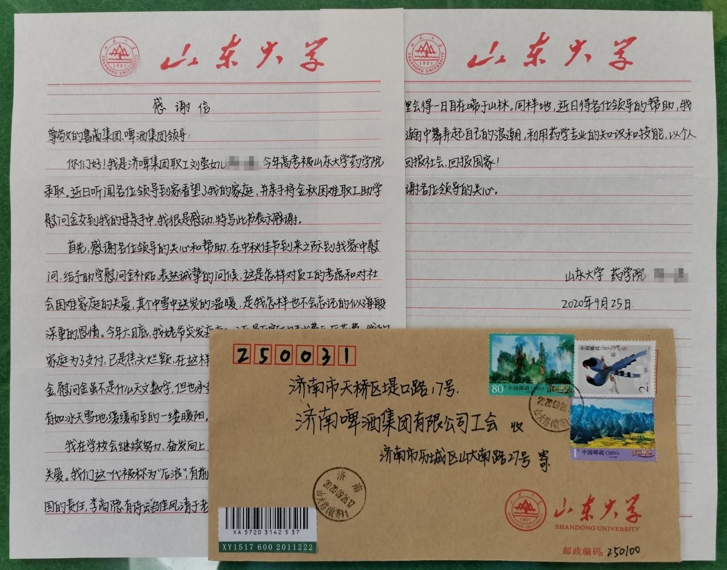 9月27日,濟啤集團收到困難職工劉瑩女兒從學校寄來的感謝信。