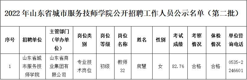 根據(jù)《中共山東省委組織部、山東省人力資源和社會保障廳關于印發(fā)2022年度省屬事業(yè)單位公開招聘工作實施方案的通知》魯人社發(fā)〔2021〕18號)等相關規(guī)定,山東省城市服務技師學院經(jīng)過公開招聘報名、考試、考察、體檢等工作,現(xiàn)對擬聘用人員(第一批)進行公示,公示期為7個工作日,自2022年8月22日至2022年8月30日(不含節(jié)假日)。公示期間,如對公示人選有異議,請及時向山東省商業(yè)集團有限公司反映。
