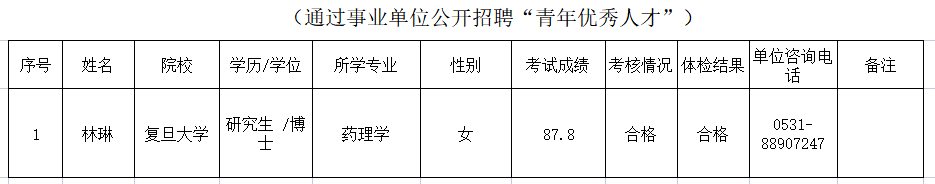 根據《關于實施2021年省屬事業單位青年優秀人才引進計劃的通知》(魯人社字〔2020〕166號)等相關規定,山東省藥學科學院組織完成了公開招聘青年優秀人才面試、考察、體檢等工作,現對擬聘用人員進行公示,公示期為7個工作日,自2021年8月26日至2021年9月3日(不含節假日)。公示期間,如對公示人選有異議,請及時向山東省商業集團有限公司反映。